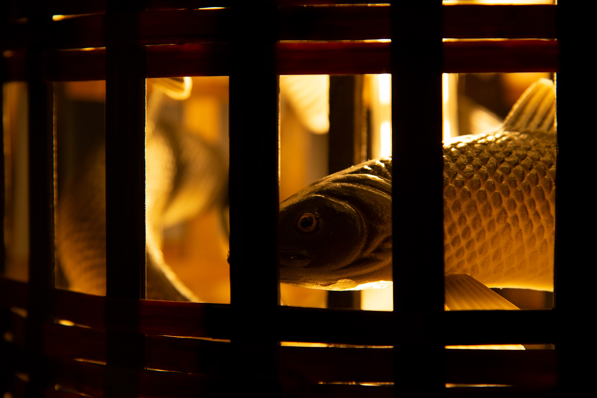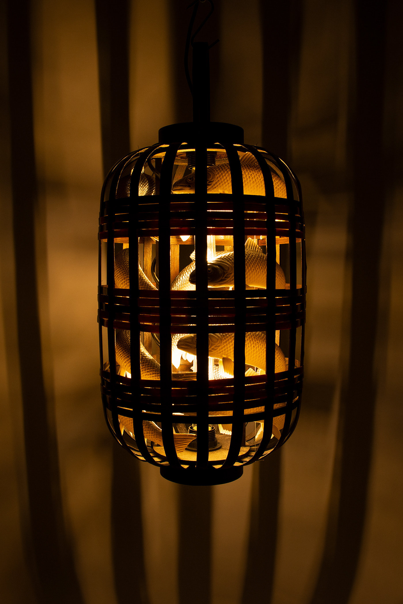 Bamboo candle holder, trapping 12 fish and 2 rod bulbs. With rod pending above the other all LEDs hang in a straight line and give a nice shadow.
