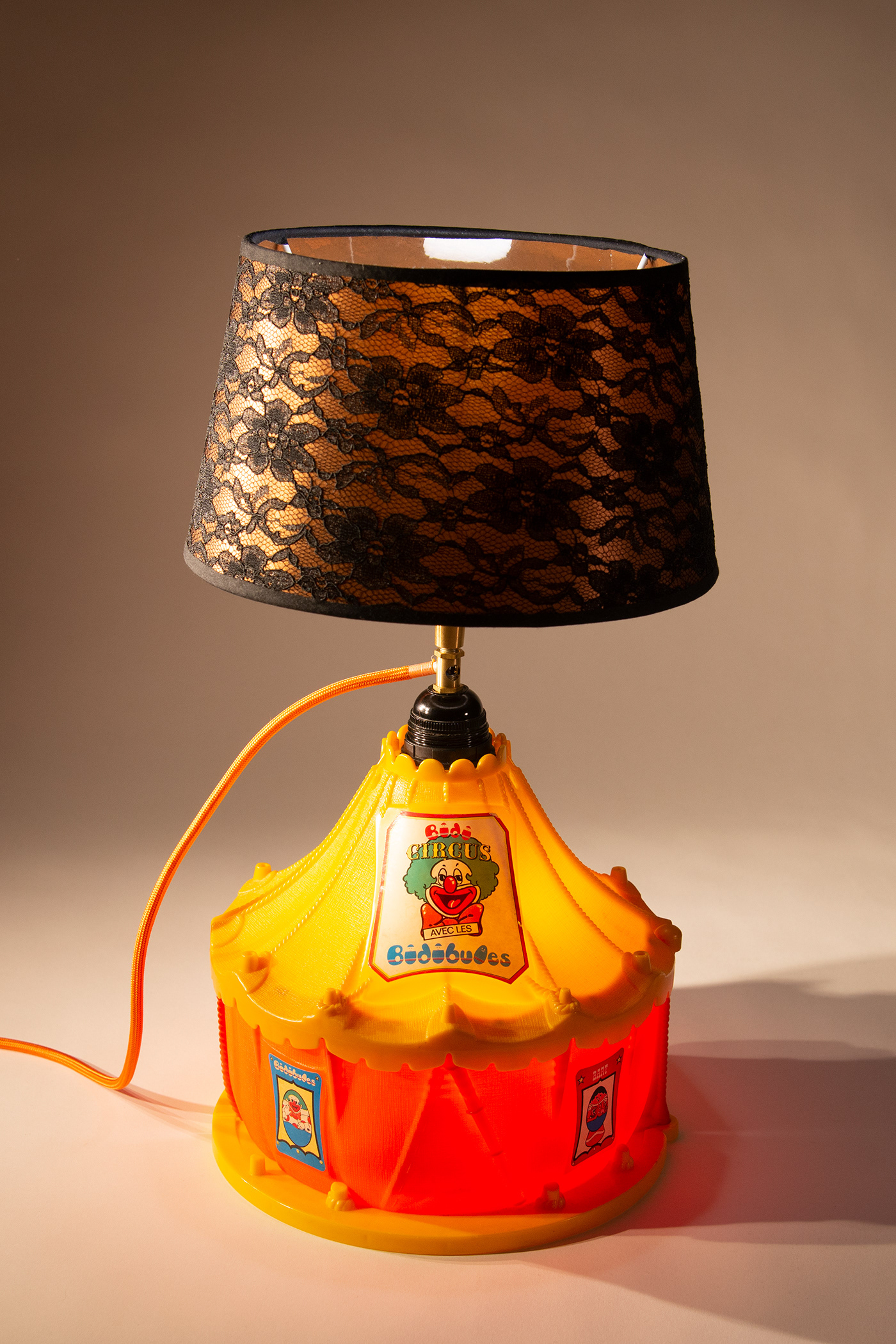 Toy circus from the Fisher-Price Little People series used as the base for a tableshade lamp. The base can be opened, the shade can be tilted. For the Circus effect 2 color changing lamps are used, one inside the shade and the other inside the base. Controlled by android or apple app.